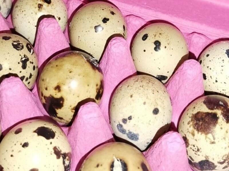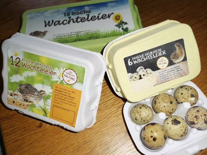Wachteleier von japanischen Legewachteln, in artgerechter Haltung mit Sandbad und saisonalen, abwechslungsreichen Unterschlüpfen wie Zweige, Wurzeln, Baumrinde